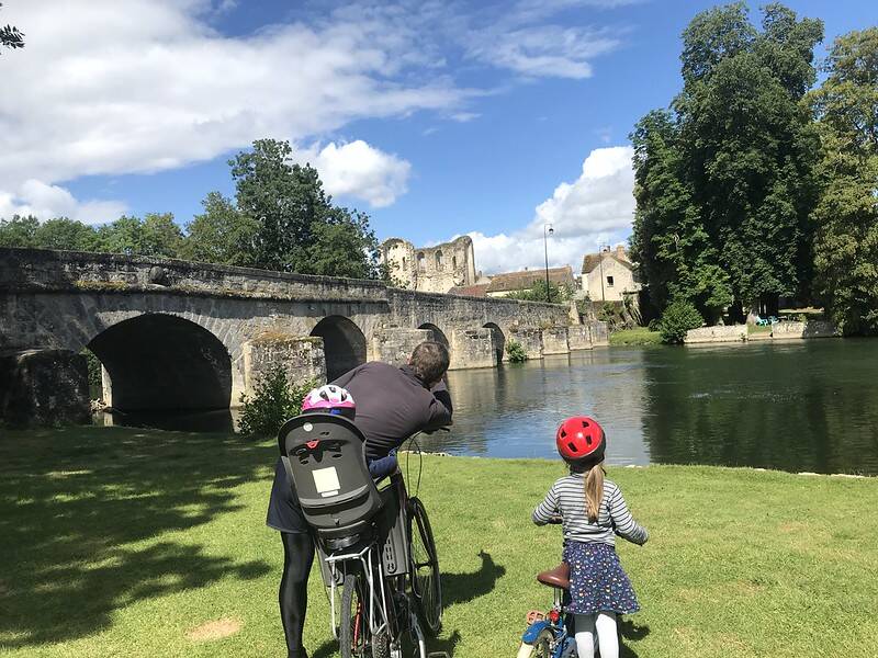 Plus tard je retrouve ma famille à la gare de Bourron-Marotte. Nous enjambons le Loing par le vieux pont de Grez-sur-Loing qui fut si souvent immortalisé par les peintres. Nous retrouvons ainsi la voie du halage aménagée le long du canal qui longe le Loing. Ma fille de 4 ans est fière d’être du voyage sur son propre vélo cette fois. (voici quelques conseils pour des vacances à vélo en famille)