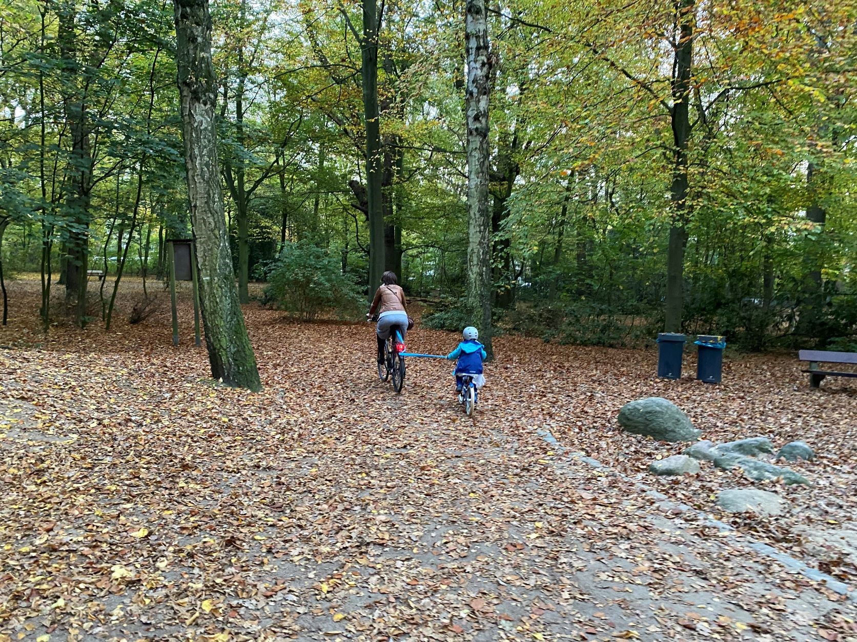En revanche après une chute sur de la descente, nous avons systématiquement détaché la sangle avant chaque descente aussi légère soit-elle. Choupinet n’ayant pas encore une maîtrise suffisante des distances de freinage. Pour la même raison nous l’avons détaché lors du retour en ville.